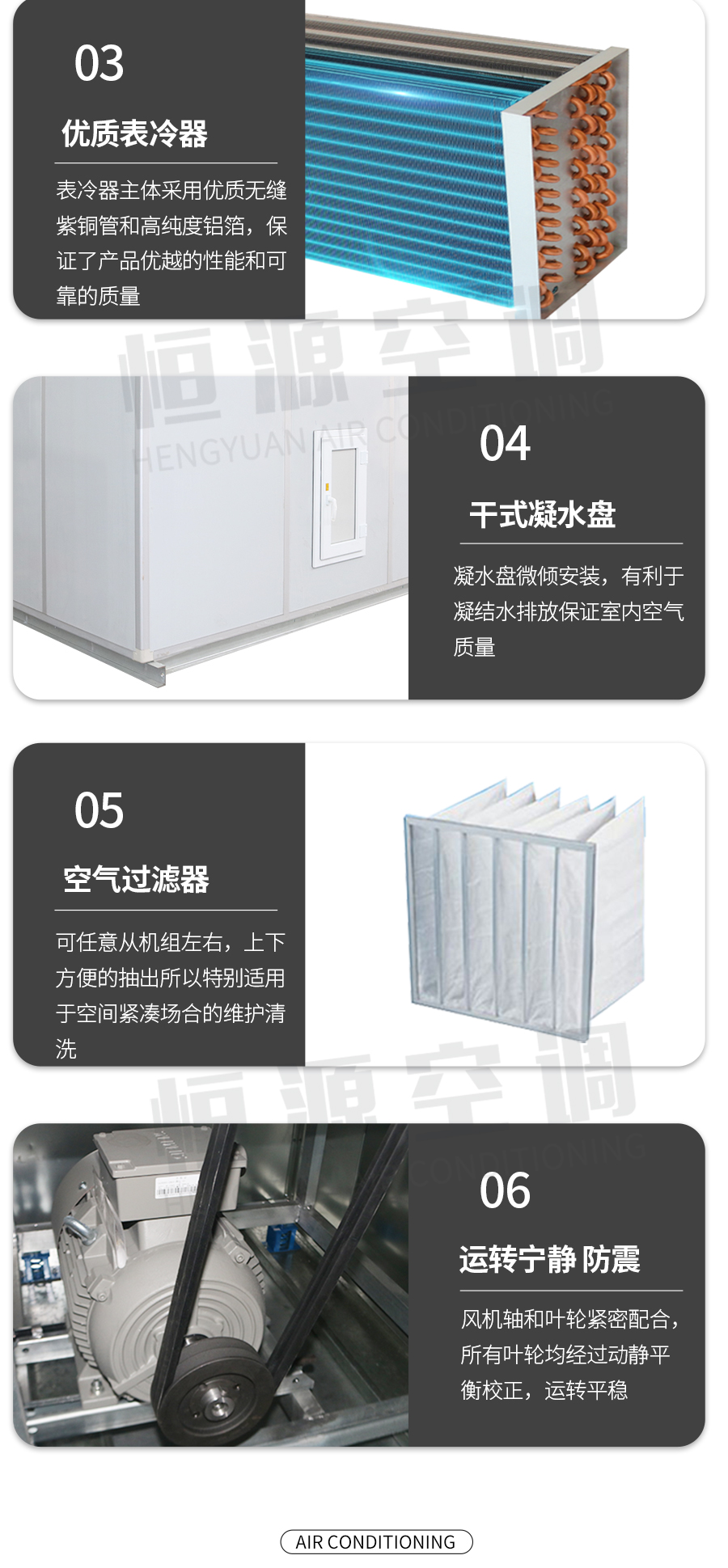 靖江市恒源空調(diào)設(shè)備制造有限公司——組合式空調(diào)機組是由各種空氣處理功能段組裝而成的一種空氣處理設(shè)備。適用于阻力大于100Pa的空調(diào)系統(tǒng)。 機組空氣處理功能段有空氣混合、均流、過濾、冷卻、一次和二次加熱、去濕、加濕、送風(fēng)機、回風(fēng)機、噴水、消聲、熱回收等單元體。